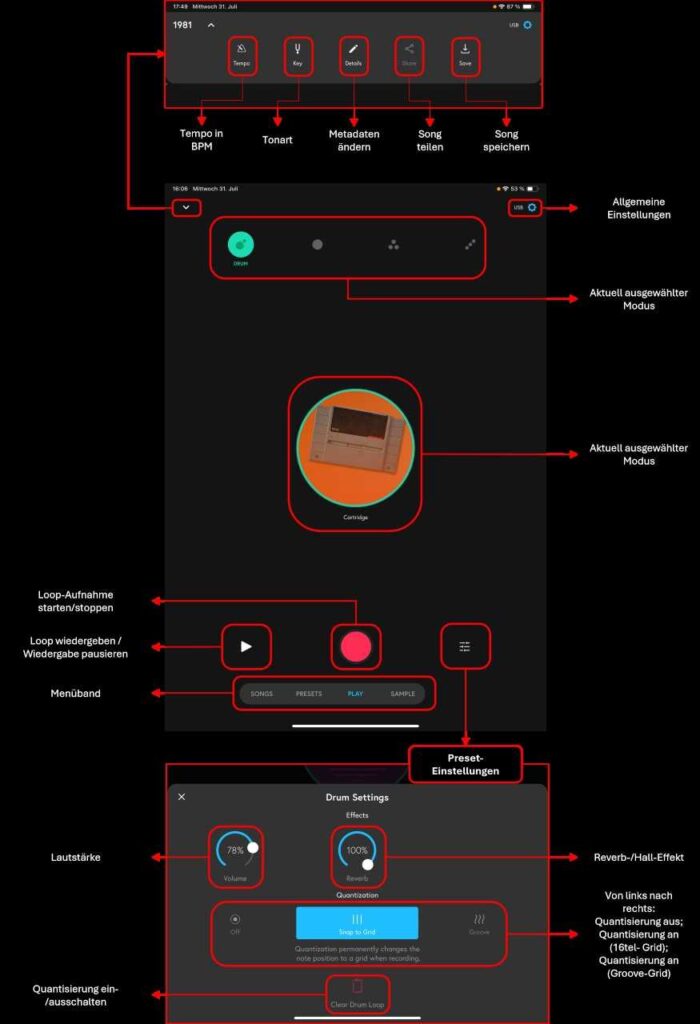 Sample-Pakete heißen in Artiphon Connect „Songs”. In einem Song sind die Samples der einzelnen Modi und Angaben zu BPM, Tonart und Effekten enthalten. Songs können durch die Nutzerinnen und Nutzer angepasst werden. Eigene Sample-Konfi gurationen (Samples, Angaben zu BPM) können als Songs gespeichert werden.
